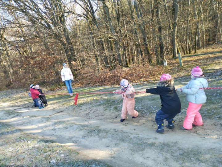 Mardi 7 février, le froid nous accompagne toujours. Activités sportives au programme: béret nature et tir à la corde.